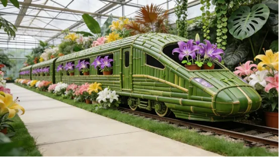 竹子编织的高铁造型首现绿博园!翠竹为车、百合为饰,寓意马年“万事顺遂、飞驰向前”。轨道两侧繁花铺展,热带绿植映衬其间——这列满载福气的“春的专列”,正等你登程。
