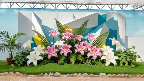 蓝白几何艺术墙,冷静秩序;前景百合盛放,热烈柔软。热带绿植柔化线条,现代设计与自然生命在此对话。这里是拍照出片的“顶流打卡点”。