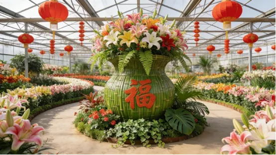 巨型花瓶饱满大气,红“福”字喜庆醒目。瓶中百合与花材喷薄而出,红灯笼高悬四周。瓶身圆融,寓意圆满;百合盛放,象征和合。元宵将近,这里许你一年福气。