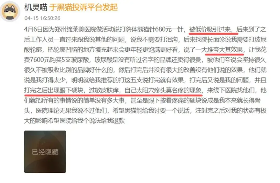 在黑猫平台上,有消费者被郑州缔莱美的“嗨体熊猫针680元”的低价活动吸引到店。