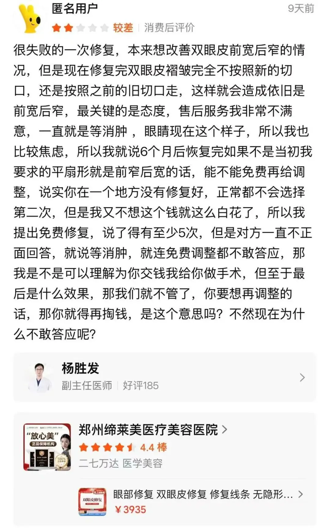 一位美团用户坦言,在郑州缔莱美做双眼皮修复手术失败。“我原本想改善前宽后窄的问题,但术后褶皱完全不按新切口走,还是沿着旧切口形成,导致依旧是前宽后窄,问题根本没有解决。