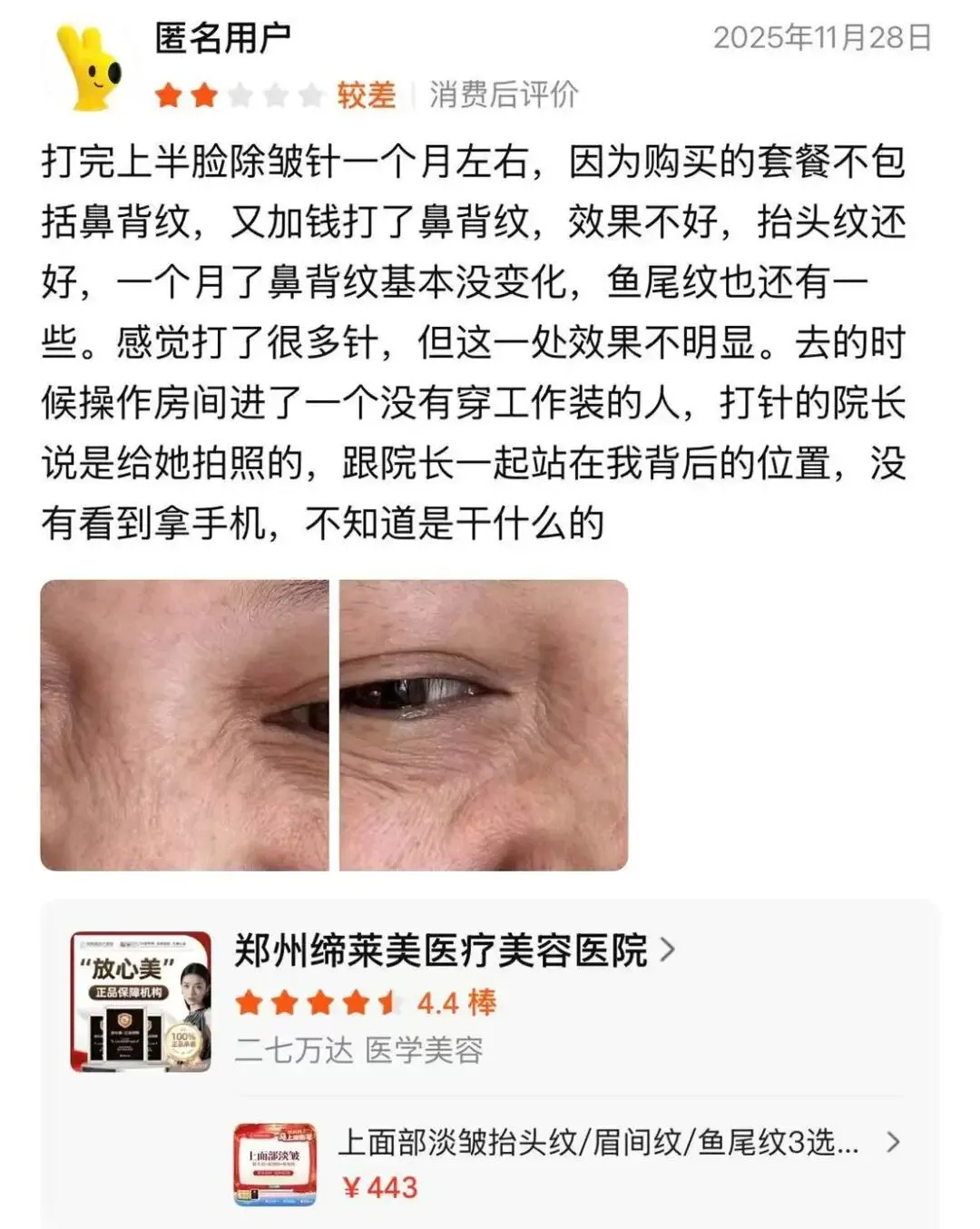 还有消费者晒出前后对比图,直指郑州缔莱美虚假宣传:“我打完上半脸除皱针约一个月后,因套餐不含鼻背纹又加钱补打,但一个月过去鼻背纹基本没变化,鱼尾纹也还有残留,只有抬头纹效果尚可,感觉打了很多针却有一处效果不明显