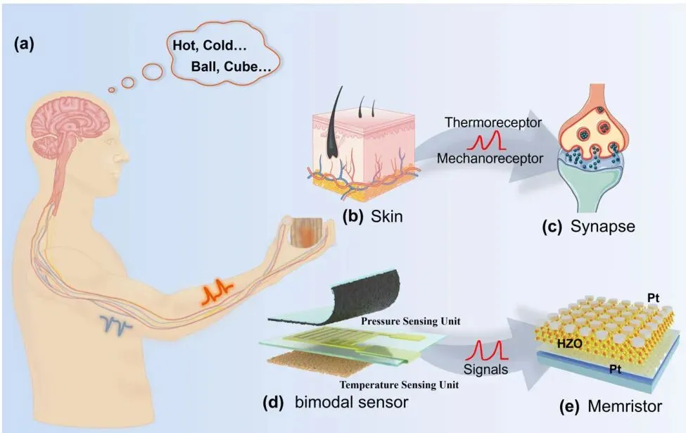 受人体体感系统的交叉模态感知能力启发,研究人员构建了一种人工交叉模态感觉神经元系统。该系统通过将压力-温度双模态传感器与基于(HZO)的互补忆阻器相结合,模拟了人体的触觉感知、神经编码和突触处理功能。所开发的双模态传感器能够采集压力和温度信息,并将其转化为电信号,其压力灵敏度高达26,407 ,温度灵敏度为-3.34% 。HZO互补忆阻器则能够实现信息存储并模拟生物突触功能,从而对感官信号进行仿生神经形态处理。在机器学习的辅助下,这一人工交叉模态感觉神经元系统在识别不同物体的温度和形状方面,展现了高达96.67%的准确率。这项工作展示了该集成系统在可穿戴人机交互界面和仿生机器人等先进神经形态硬件领域的应用潜力。