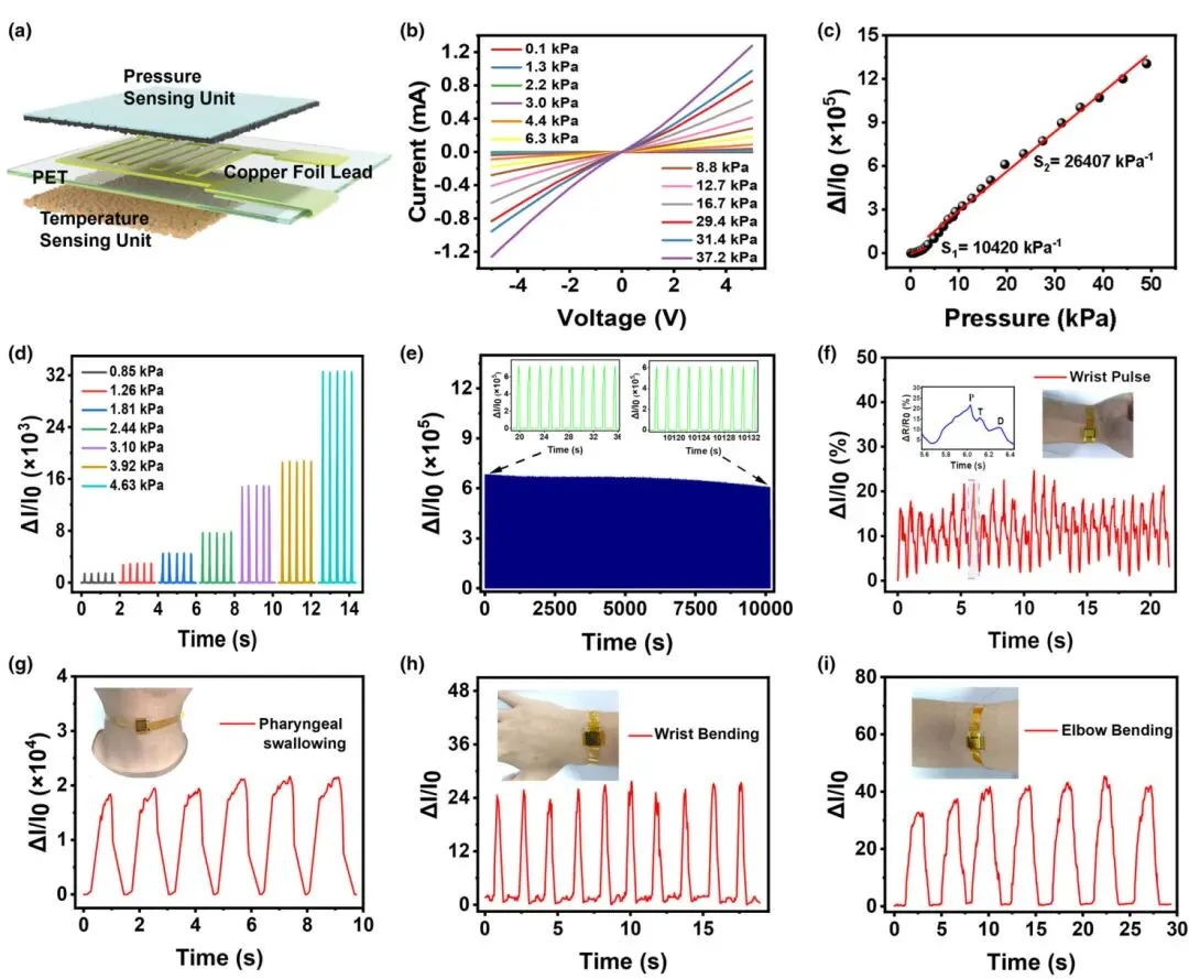 图2. 压力-温度双模态传感器的压感性能表征。 a) 压力-温度双模态传感器示意图。b) 不同压力下传感器的I-V曲线。c) 传感器在0.1至49 kPa压力范围内的电流响应。d) 传感器在0.85至4.63 kPa压力脉冲下的电流响应。e) 在15 kPa高压下超过7000次重复加载/卸载循环的耐久性测试。f) 手腕脉搏的实时监测。g-i) 分别为咽部吞咽、手腕弯曲和肘部弯曲动作的相对电阻变化响应。