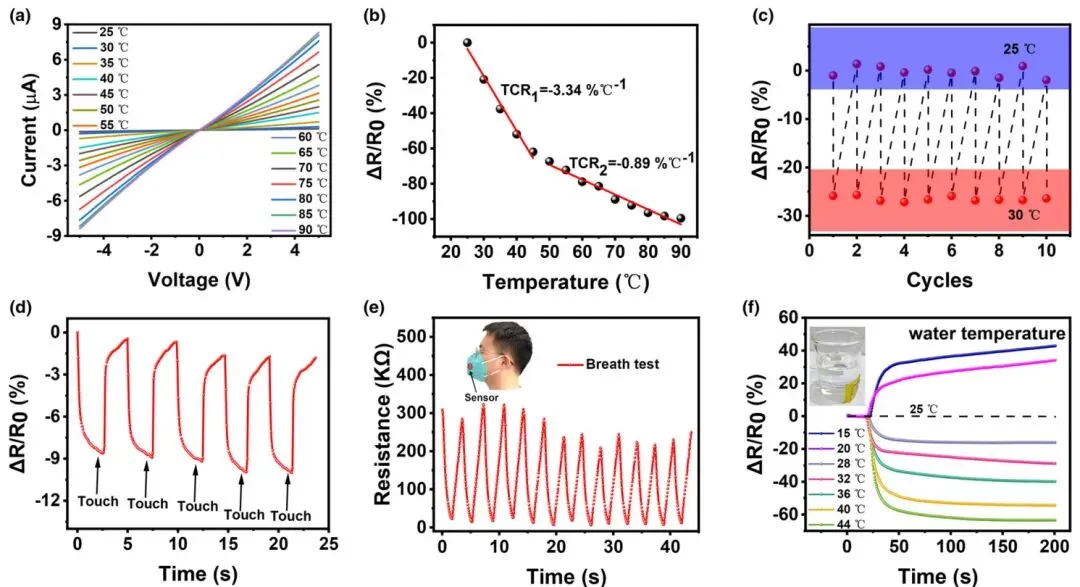 图3. 压力-温度双模态传感器的温感性能表征。 a) 不同温度下传感器的I-V曲线。b) 传感器在25至90 °C温度范围内的电阻变化。c) 传感器在25和30 °C之间重复冷却和加热时的温度感应能力。d) 传感器的触摸响应。e) 通过传感器动态监测呼吸。f) 连接到烧杯的传感器在不同水温(15-44 °C)下的电阻变化。