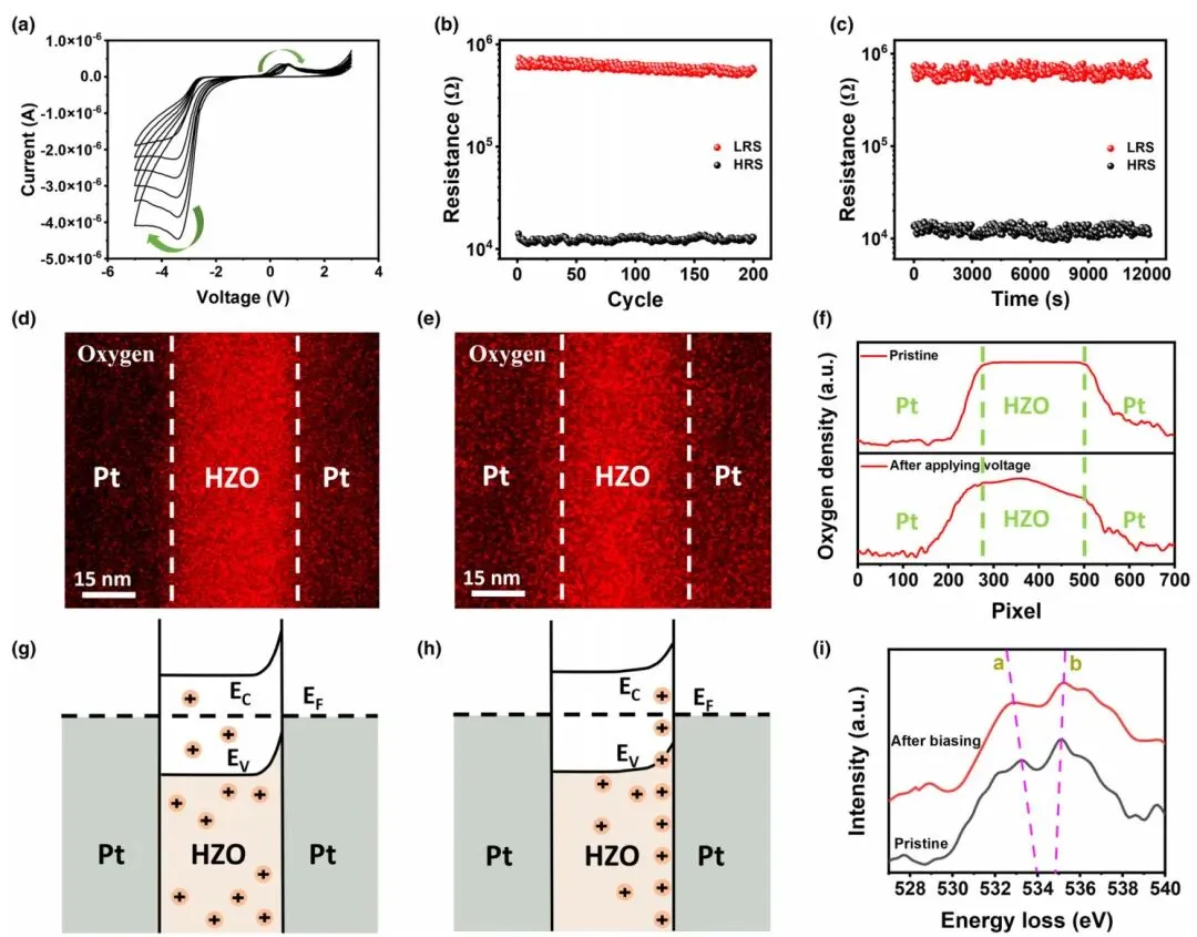 图4. HZO基互补忆阻器的电阻开关特性和导电机理。 a) 在(-5V, 3V)直流扫描范围内的I-V曲线,展示了互补电阻开关行为。b) 忆阻器的耐久性行为。c) 忆阻器高阻态(HRS)和低阻态(LRS)的保持时间。d,e) 样品在原始状态和施加偏压下的氧元素EDS映射图。f) 原始状态和偏压状态下氧密度分布的比较。g,h) 器件在高阻态和低阻态下的能带图。i) HZO薄膜在偏压前后的O K-edge EELS谱。