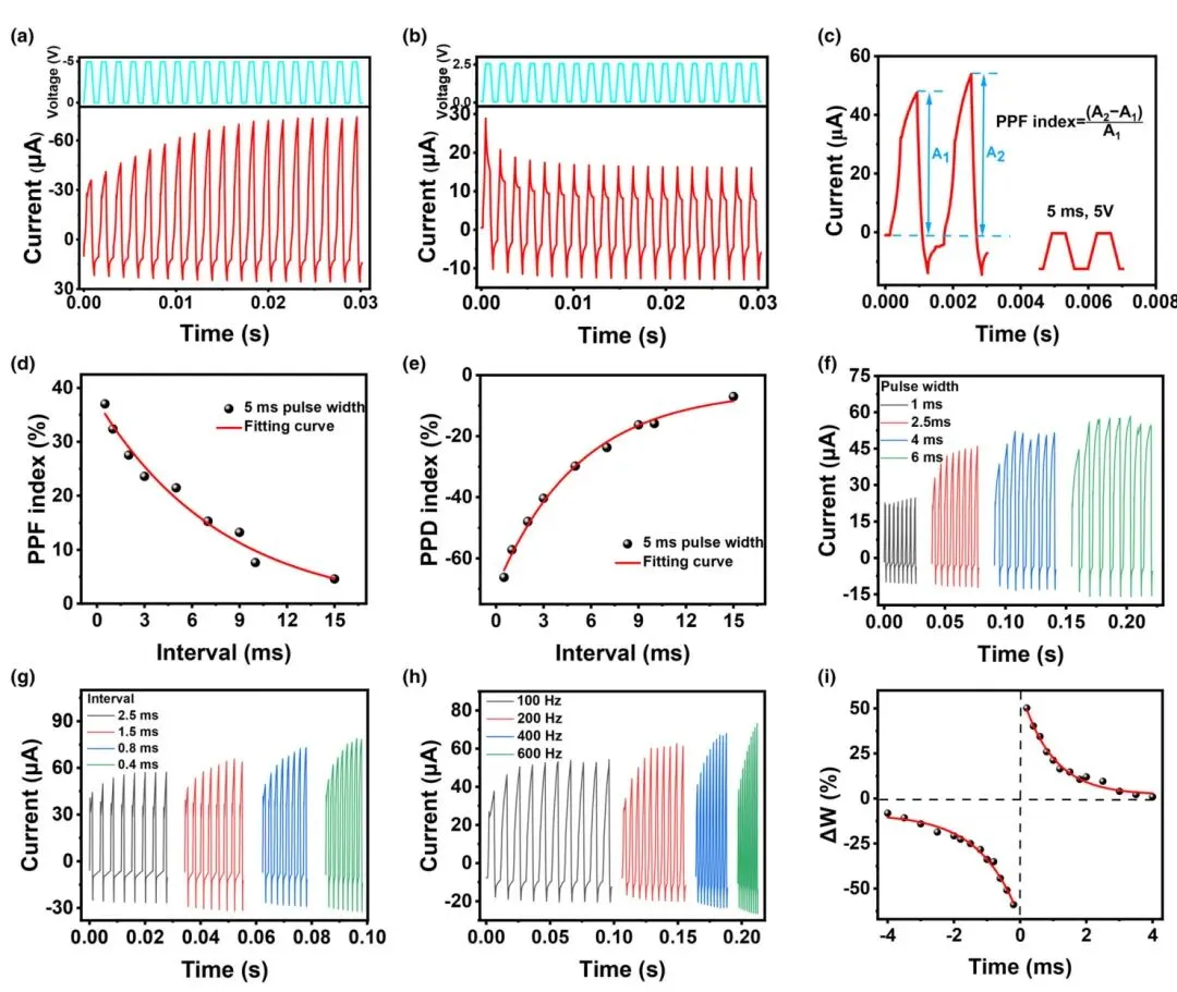 图5. HZO基互补忆阻器的突触行为。 a) 负脉冲下的兴奋性突触后电流(EPSC)可塑性模拟。b) 正脉冲下的抑制性突触后电流(IPSC)可塑性模拟。c) 由两个脉冲触发的双脉冲易化(PPF)。d,e) PPF指数和PPD指数随脉冲间隔时间的变化。f) 脉冲宽度依赖可塑性(SWDP)。g) 脉冲间隔依赖可塑性(SIDP)。h) 脉冲频率依赖可塑性(SRDP)。i) 脉冲时间依赖可塑性(STDP)。