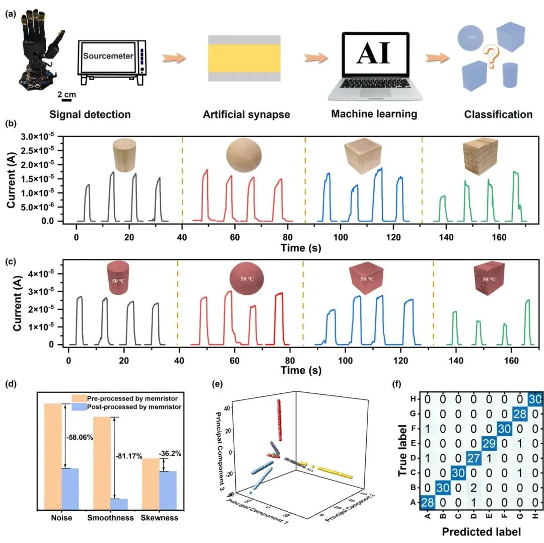 如图6a所示,当机器人手抓取不同形状(圆柱、球形、立方、长方体)和不同温度(25°C、50°C)的物体时,传感器将采集到的触觉信号传递给忆阻器进行处理。对比处理前后的信号(图6b,c),研究发现经忆阻器处理后,信号的噪声降低了58.06%,平滑度降低了81.17%,偏度降低了36.2%(图6d),表明忆阻器显著提升了信号质量,使其更平滑、稳定,有效模拟了生物神经系统对原始感官信号的预处理过程。