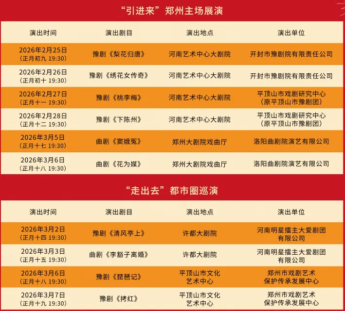展演剧目均为都市圈文艺院团的精品力作,涵盖传统经典、伦理教化、家国情怀、民间风情等多元题材,戏剧“梅花奖”得主、一级演员张艳萍,常派再传弟子连德志,豫剧名家李树建亲传弟子李新伍,梨园春明星擂主陈奇,一级演员郑庆恩、张晓红、孔素红、白伟,二级演员袁月月、周艳凤、赵小霞、郑培培等名家轮番上演,尽显中原戏曲魅力。