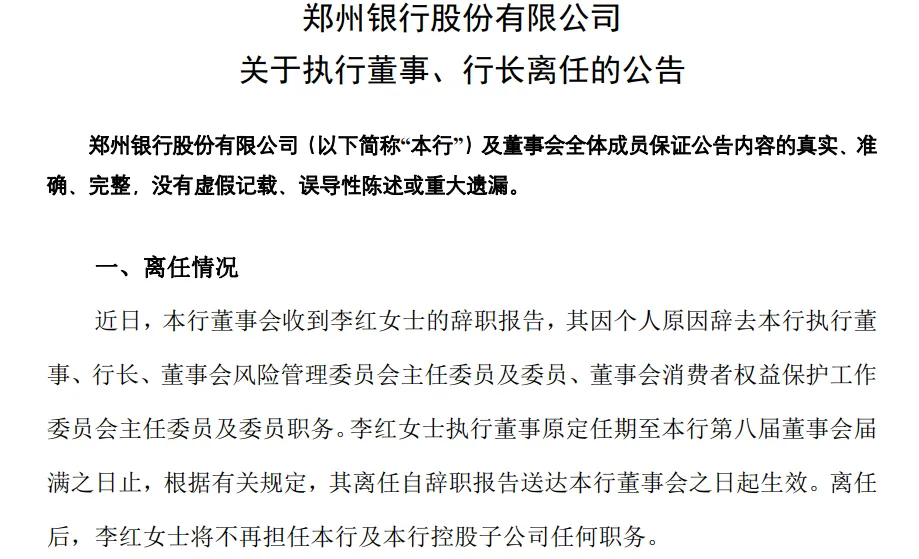 公告显示,李红此次辞去的职务包括郑州银行执行董事、行长,以及董事会风险管理委员会、消费者权益保护工作委员会的主任委员及委员。离任后,李红将不再参与郑州银行及旗下控股子公司的任何经营管理工作,且截至公告发布之日,其未持有该行任何股份,与董事会亦无任何分歧,无未披露事项需告知股东。