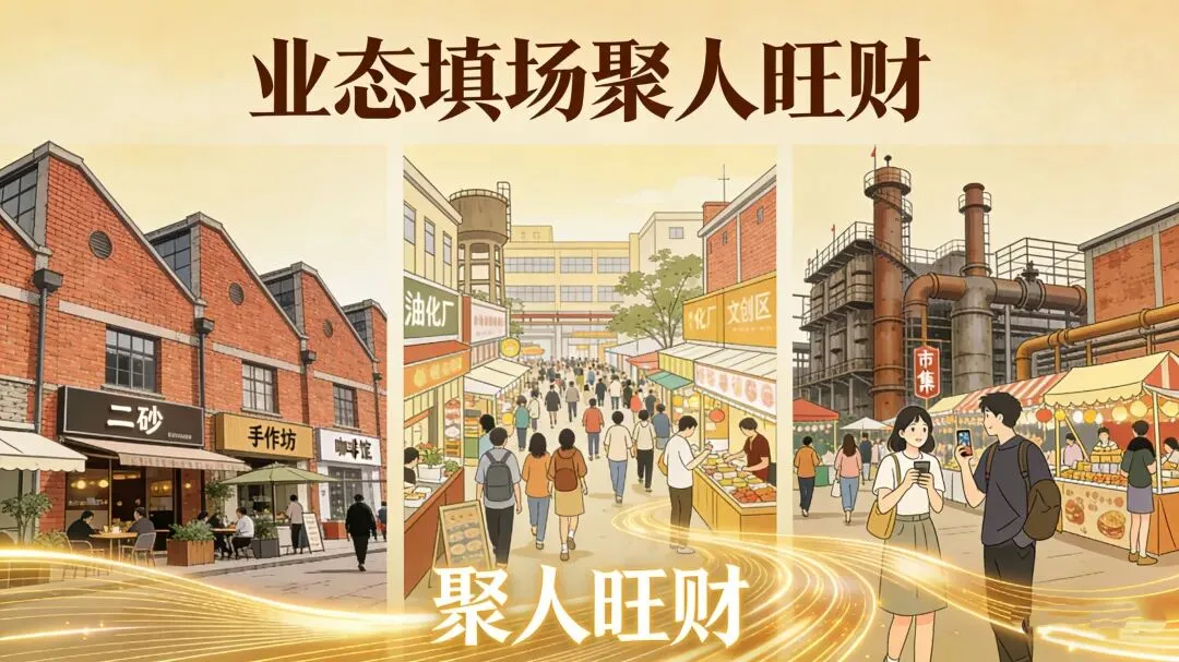 油化厂更懂郑州人的烟火气,把皂基钢罐改成摇滚舞台,洗衣粉储料缸变成水幕,混凝土管道做成音乐市集,朱雀市集、复古市集、非遗市集连成片,营业到凌晨2点的小吃摊、民谣演出、机车文化,把郑州人的夜生活搬进老厂房,日均5万客流、年接待近千万人次,烟火气就是最旺的财气,这就是风水里“人气催财”的最好体现。