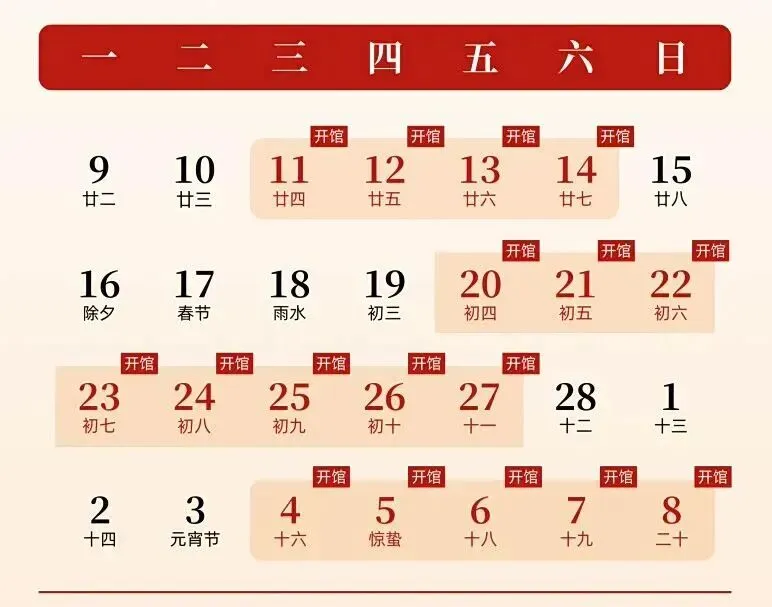2月14日(腊月二十七)、2月20日—2月27日(正月初四至十一)正常开馆。