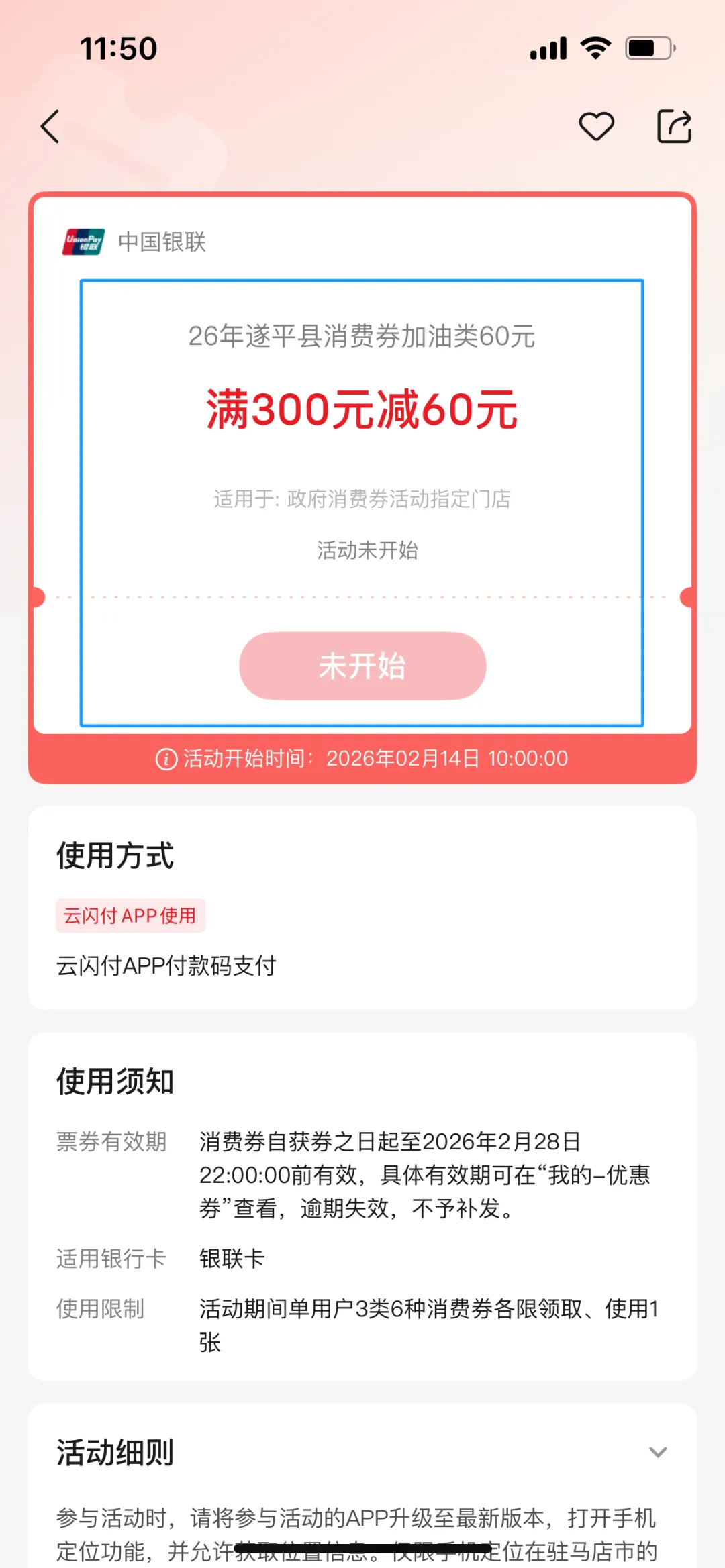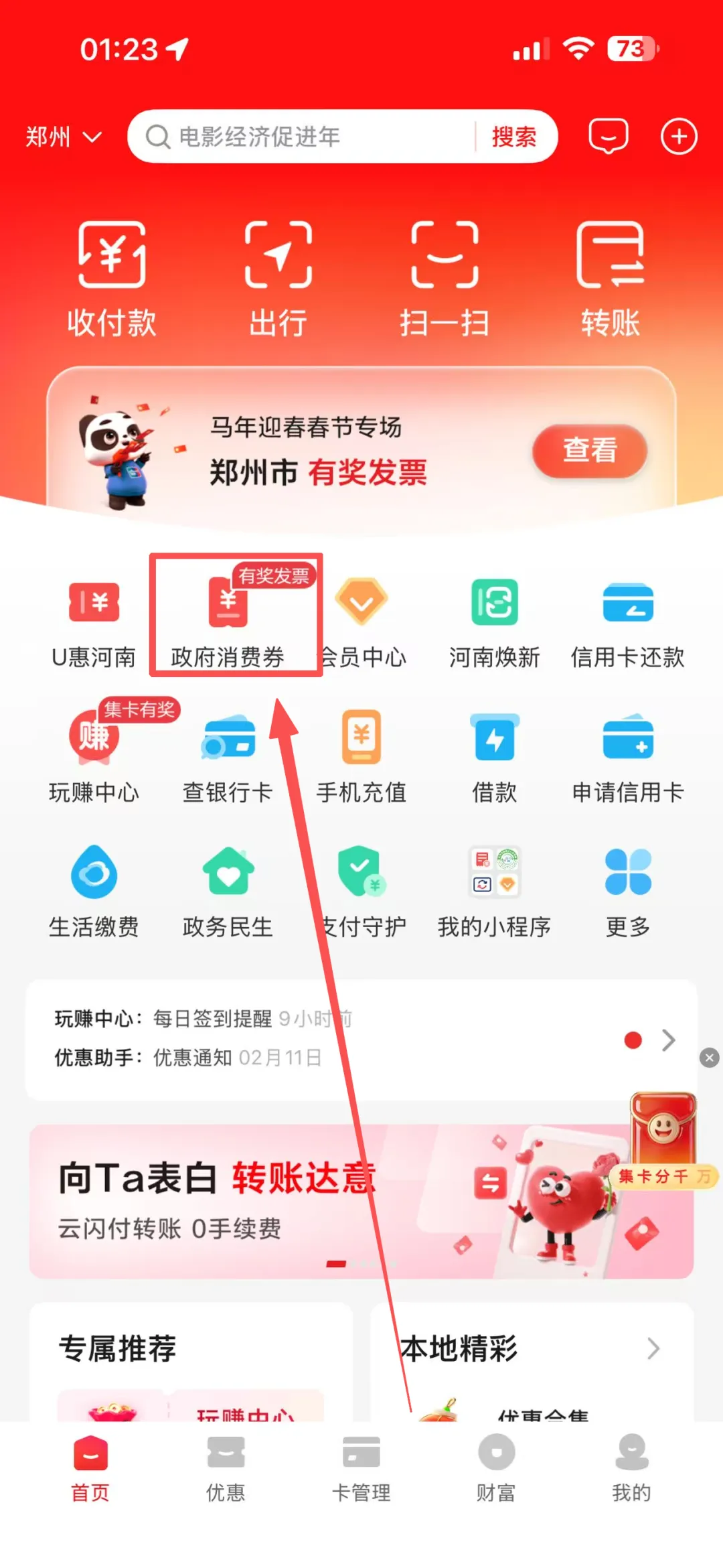 云闪付,点击左下角【郑州本地宝】头像,发送【驻马店消费券】,获取申领流程/入口,驻马店部分县市不太一样,大家看清楚领取面额和适用商家。