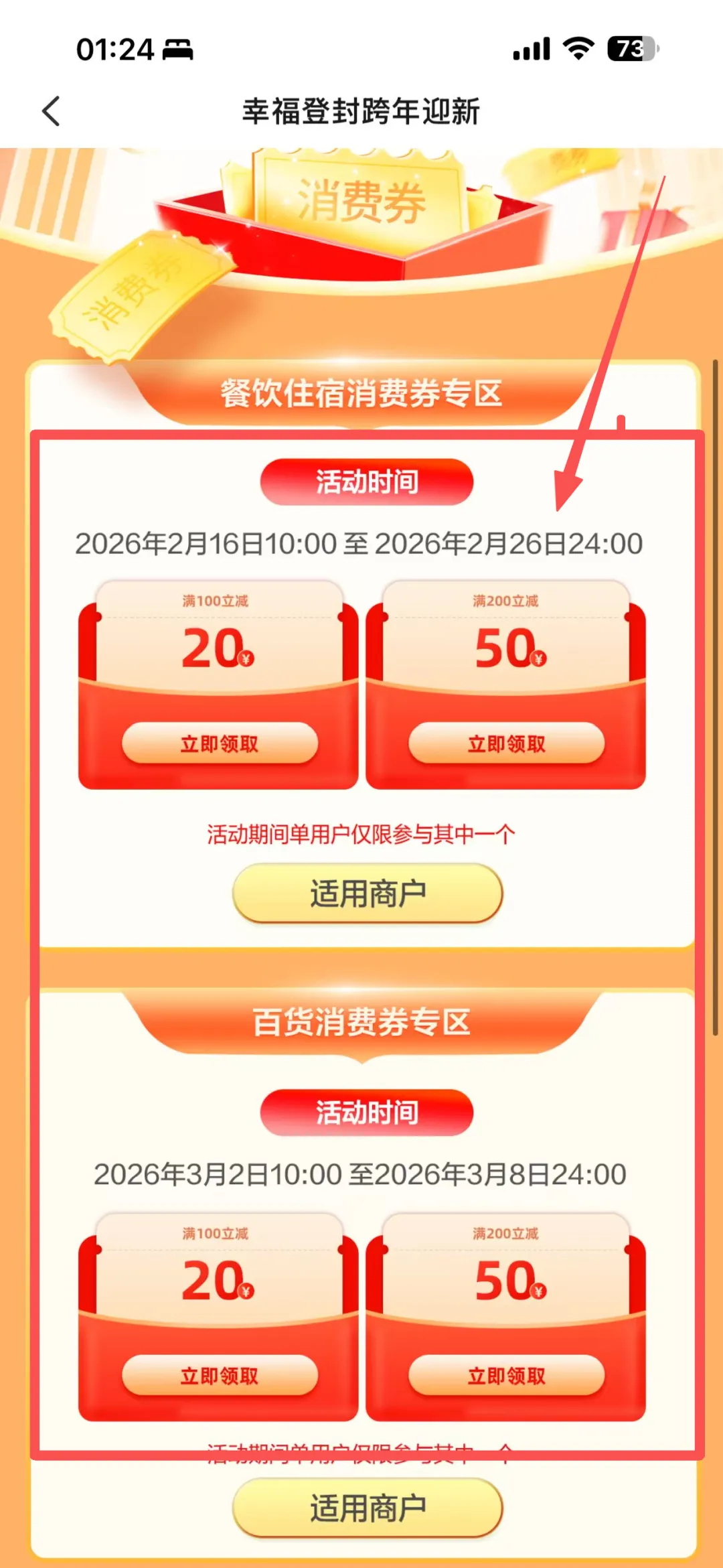 1️⃣餐饮住宿消费券:2月16日至2月26日每日上午10:00