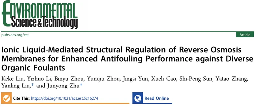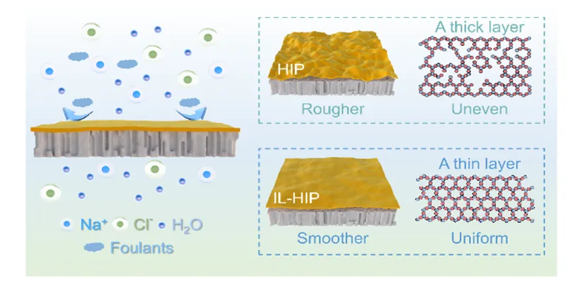 调控肼与均苯三甲酰氯的界面聚合过程,成功制备了具有优异结构和性能的Hz基聚酰胺反渗透膜(IL-HIP)。Figure 2 的系统表征表明,IL-HIP膜表面呈现均匀平滑的形貌,其粗糙度(Ra=16.2 nm)显著低于对照组CIP膜(42.8 nm)和HIP膜(26.0 nm)。XPS分析进一步显示,IL-HIP膜表面含氮官能团分布更为均匀,且酰胺键密度较低,说明IL的加入有效抑制了单体的过度交联,促进了更有序、更薄(仅24 nm)的选择层形成。
