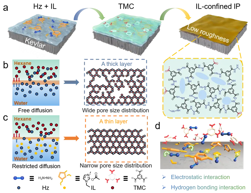 Fig. 1. Schematic of IL-mediated RO membrane fabrication. (a) IL-confined IP process on Kevlar substrate. (b) Free diffusion of Hz forming a thick layer with non-uniform pores. (c) Restricted diffusion of Hz by IL forming a thin layer with uniform pores. (d) Electrostatic and hydrogen bonding interactions between IL and Hz.