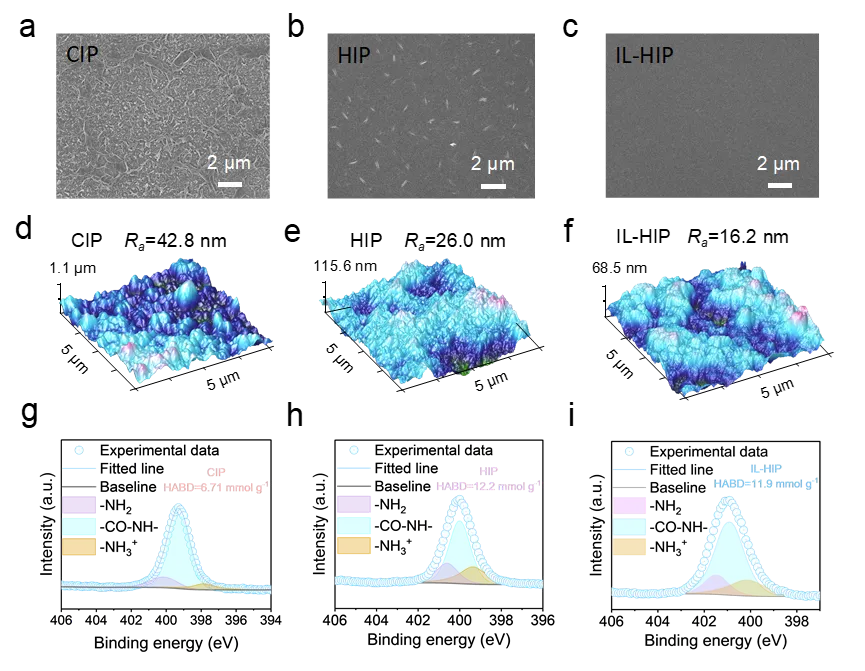 Fig. 2.Morphologies and chemical compositions of membranes. (a-c) SEM images; (d-f) AFM images with roughness (Ra); (g-i) XPS N 1s spectra deconvolution for CIP, HIP, and IL-HIP membranes, revealing nitrogen-containing functional group distributions.