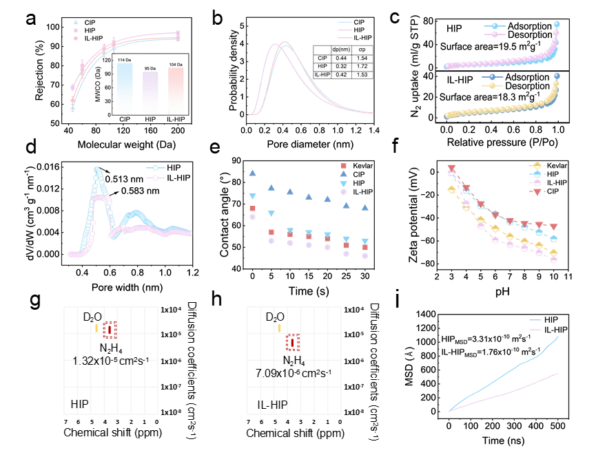 Fig. 3.Structural and physicochemical properties of membranes and the monomer diffusion characteristic affected by IL. (a) Rejection of neutral organic compounds, determined MWCO and (b) estimated pore size distribution. (c) N₂ adsorption-desorption isotherms and calculated specific surface areas. (d) Pore size distribution of polymers derived from N₂ adsorption-desorption isotherms. (e) Contact angles over time. (f) Zeta potentials as a function of pH.(g, h) Pulsed-field gradient nuclear magnetic resonance (PFG-NMR) diffusion coefficients of D₂O and N₂H₄ in HIP and IL-HIP membranes, reflecting mass transport behaviors. (i) MSD curves obtained from MD simulations, showing molecular mobility over time.