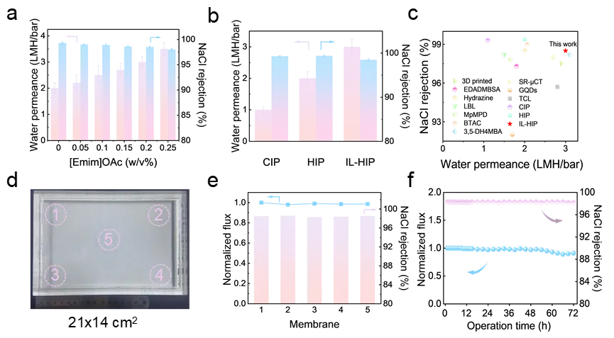 深入揭示了IL的调控机制及其对膜结构的影响。扩散实验与分子动力学模拟共同证实,IL通过氢键和静电作用显著减缓了Hz单体向界面的扩散,扩散系数降低近50%,从而使界面聚合过程更为可控。这一调控机制直接促使IL-HIP膜具备更窄的孔径分布、更高的表面亲水性以及更强的表面负电性(Zeta电位结果),这些特性为提升膜的抗污染能力奠定了结构基础。Fig. 4.Membrane separation performance. (a) Variation in the permselectivity of Hz-based membranes with changing the IL concentration. (b) Comparison of the permselectivity among three membranes. (c) Performance comparison between the IL-HIP membrane and the previously reported membranes (relevant data are available in Table S1 of the Supplementary Information). (d) Schematic diagram of the scaled-up membrane module. (e) Performance of the fabricated membrane at five different positions in the scaled-up membrane module. (f) Stability test of the IL-HIP membrane over 72 h.展示了IL-HIP膜卓越的分离性能。其水通量高达3.0 LMH/bar,同时保持了98.5%的高NaCl截留率。此外,该膜在大面积制备和长达72小时的连续运行中均表现出良好的性能稳定性和可扩展潜力,证明了其实际应用价值。