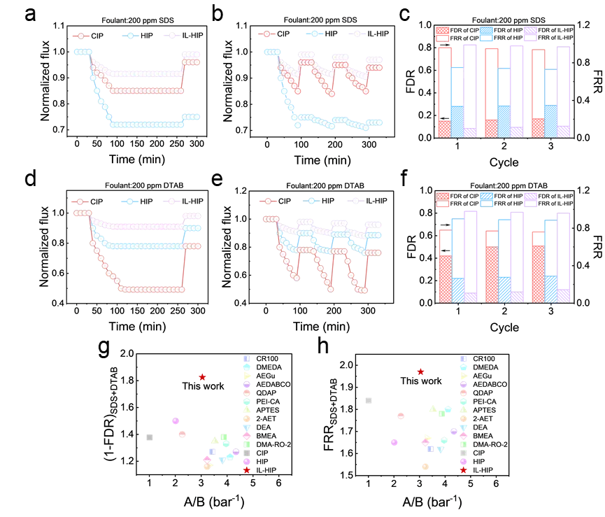 Fig. 5. Membrane antifouling performance towards SDS and DTAB. (a,b) Normalized flux profiles of the membranes during one or three cycles of 200 ppm SDS fouling and water flushing, showing flux decline and recovery behaviors. (d,e) Normalized flux profiles of the membranes during one or three cycles of 200 ppm DTAB fouling and water flushing, showing flux decline and recovery behaviors. Fouling decline ratio (FDR) and flux recovery ratio (FRR) for (c) SDS-fouled and (f) DTAB-fouled membranes across 3 cycles.The trade-off between permselectivity and antifouling performance for various RO membranes, including data from this study and prior reports. The x-axis denotes the A/(1-Rj) ratio (Rj represents the NaCl rejection), while the y-axis indicates (g) the sum of (1-FDR) and (h) the sum of FRR values obtained from fouling tests using both SDS and DTAB. The antifouling experiments were performed in triplicate on at least three independently prepared membranes for each condition.系统评估了膜的抗污染性能。面对包括阴离子表面活性剂(SDS)、阳离子表面活性剂(DTAB)在内的多种污染物,IL-HIP膜均展现出优异的抗污特性。在污染测试中,其通量下降率(FDR)普遍低于10%,且经简单水力清洗后,通量恢复率(FRR)超过98%。尤为重要的是,在针对SDS和DTAB的多轮污染-清洗循环中,IL-HIP膜的通量下降与恢复行为始终保持稳定,其综合抗污染性能显著优于对照组及文献中多数已报道的反渗透膜。这归因于其光滑的表面、均匀的孔径分布、高亲水性及适宜的带电性共同构筑的物理与化学屏障,有效抑制了不同类型污染物的吸附与沉积。