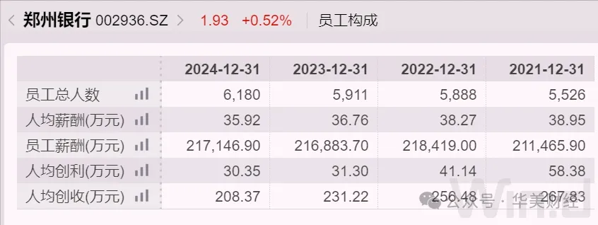 规模扩张的同时,郑州银行也为地方提供了大量就业岗位。截至2024年末,该行职工总数超过6000人,且最近几年持续增长。薪酬方面,2024年该行人均创利30.4万元,较2023年略有回落;人均税前薪酬近36万元,虽连续几年呈下降趋势,但根据万得大数据显示,这一薪酬水平在郑州所有上市企业中高居首位。需要说明的是,此处人均薪酬包含工资、社保、公积金以及其他福利等公司为员工支出的全部成本。