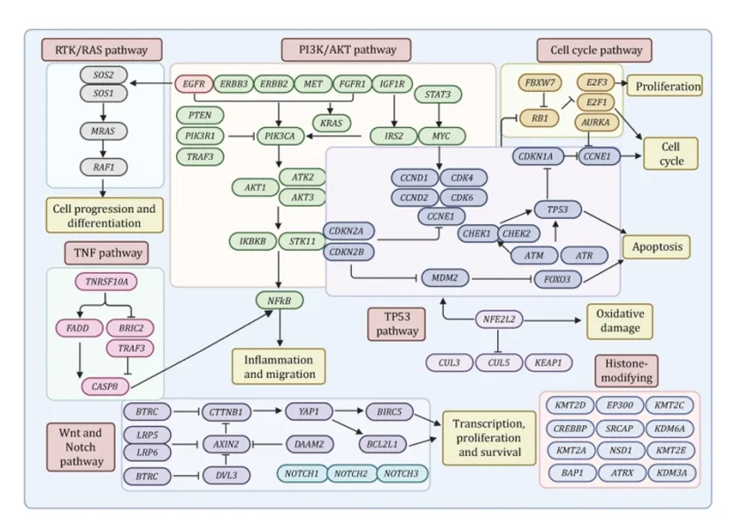 基因组层面:通过全基因组 / 外显子测序,明确 TP53、NOTCH1、FAT1 等为 ESCC 高频突变基因,RTK/RAS、PI3K/AKT、Wnt 等为核心致癌通路,绘制出 ESCC 基因组全景图谱(图 1)。