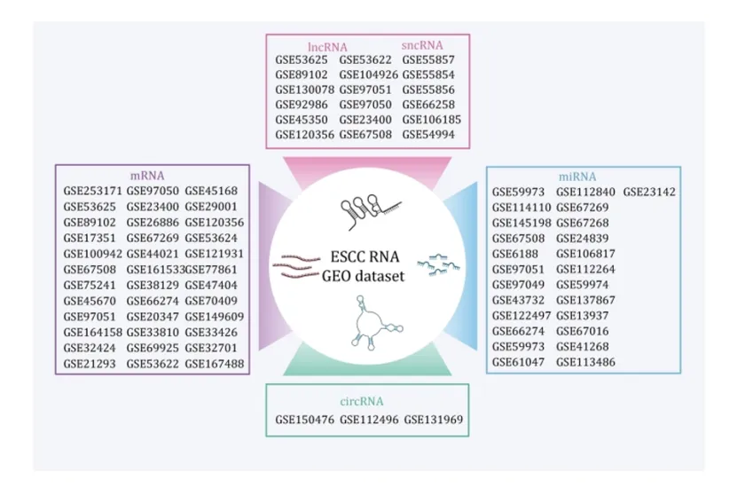 转录组层面:整合 GEO 公共数据集,系统解析 mRNA、lncRNA、miRNA、circRNA 等多 RNA 层表达特征,筛选出 ANO1、MMP3、PLEK2 等与 ESCC 预后密切相关的基因(图 2)。