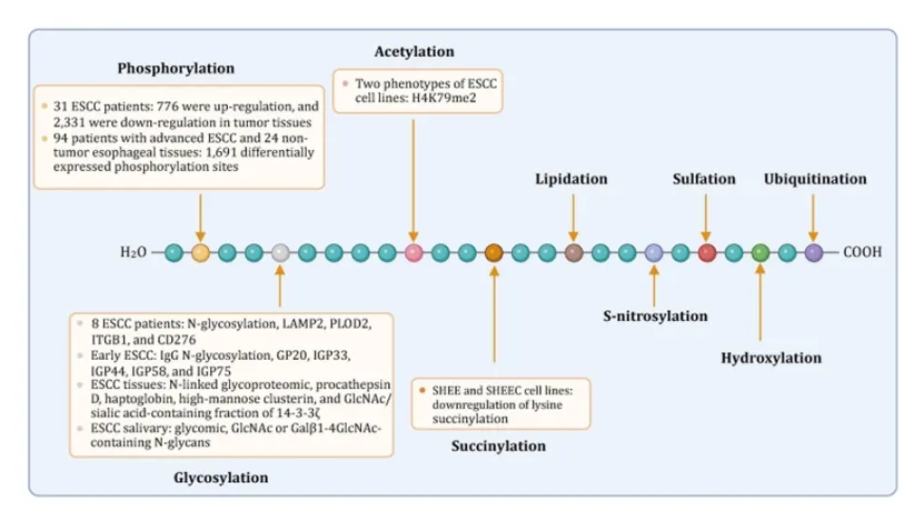 蛋白翻译后修饰分析:总结出磷酸化、糖基化、乙酰化是 ESCC 的关键蛋白调控方式,为后续靶点挖掘提供了全新方向(图 4)。