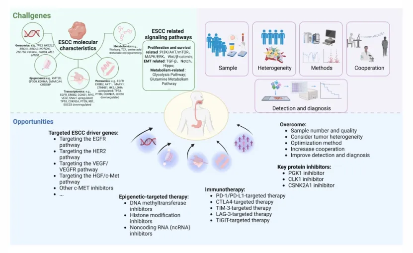 指出领域挑战:ESCC 多组学研究存在样本匮乏、肿瘤异质性大、分析流程不标准、多中心验证不足等问题。