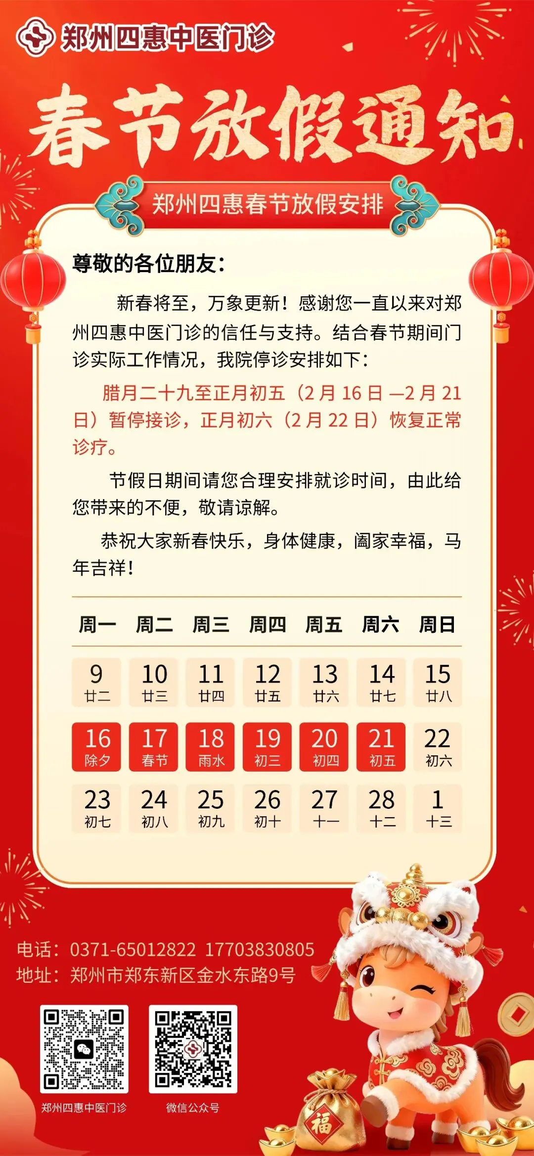 辞旧迎新贺马年|郑州四惠中医门诊春节停诊通知