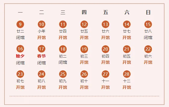 2月16日(除夕)至2月17日(正月初一)闭馆。