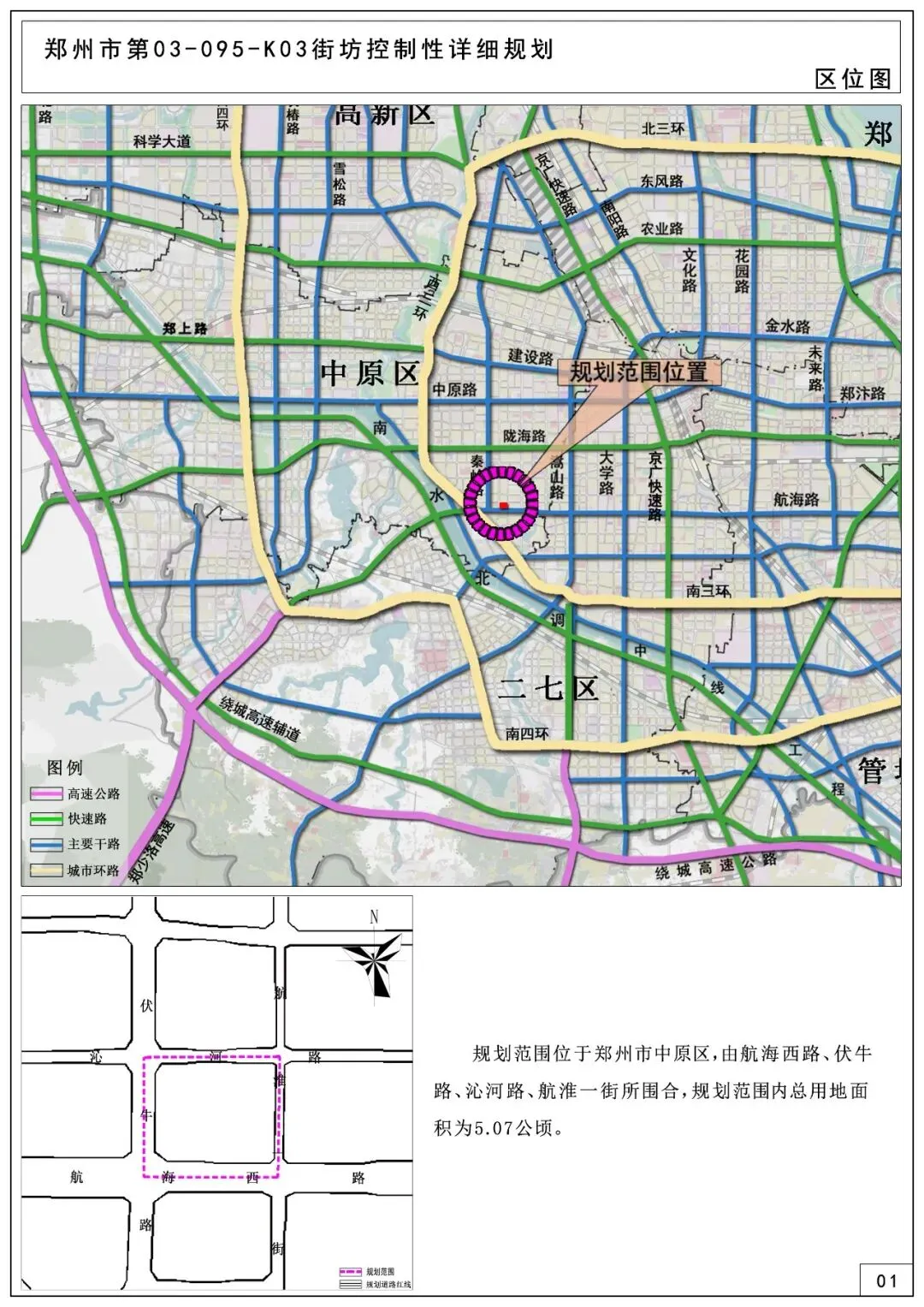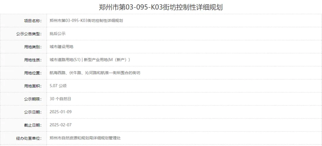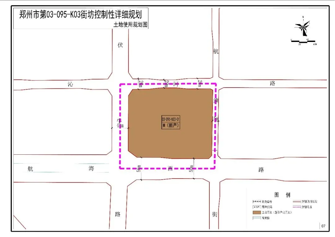 郑州市第 03-095-K03 街坊控制性详细规划完成批后公示,该街坊位于航海西路、伏牛路等围合区域,用地面积 5.07 公顷,含城市道路与新型产业用地。