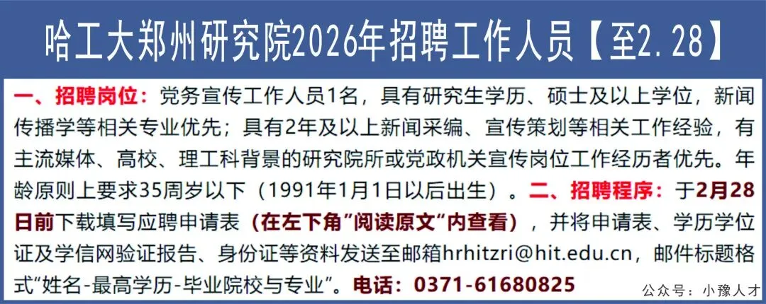 >哈工大郑州研究院2026年招聘工作人员【至2.28】