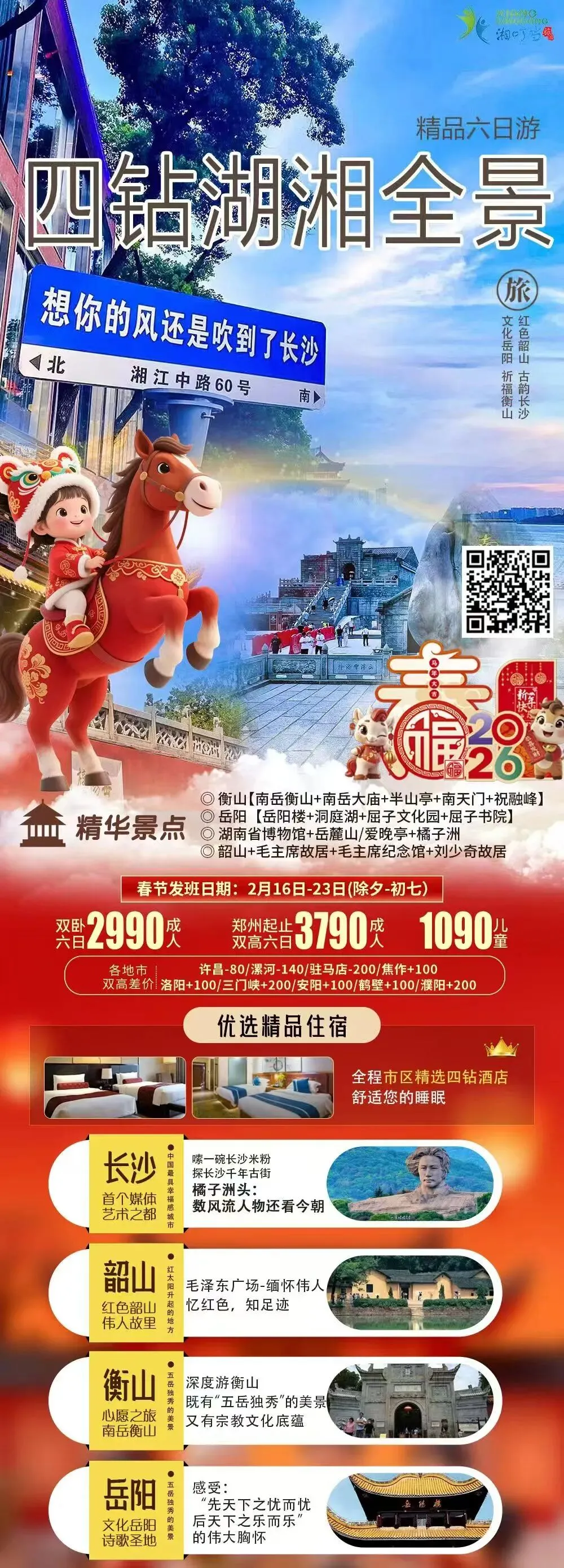 2月16-23号【四钻湖湘全景】郑州起止长沙韶山衡山岳阳双卧六日2990元