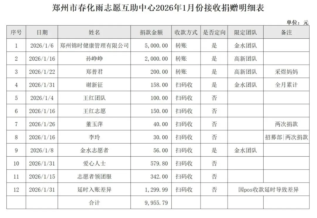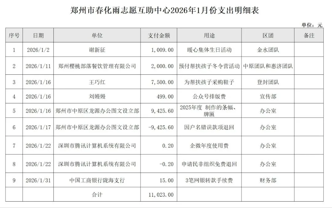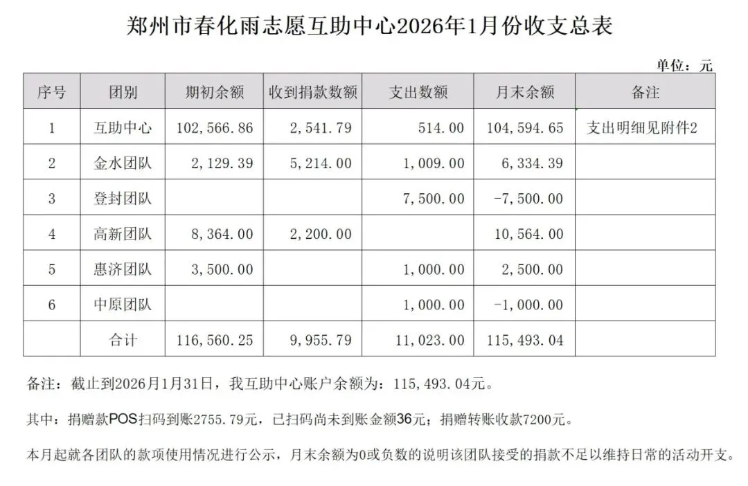 感恩每一家支持郑州市春化雨志愿互助中心的爱心企业,每一位爱心人士!现将互助中心2026年1月财务收支情况进行对外公示!