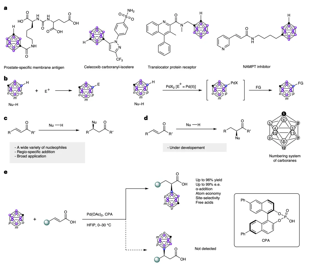 a碳硼烷在药物研发与化学生物学领域的应用;b 碳硼烷的亲电取代反应及钯(II)催化的选择性硼氢键活化反应;c 不对称迈克尔加成反应;d 不对称反迈克尔型加成反应;e 本研究内容:钯(II)催化碳硼烷与α,β-不饱和羧酸的不对称迈克尔加成及反迈克尔加成反应。注:NAMPT为烟酰胺磷酸核糖转移酶;FG为官能团;α-加成指在羧基α位发生的加成反应