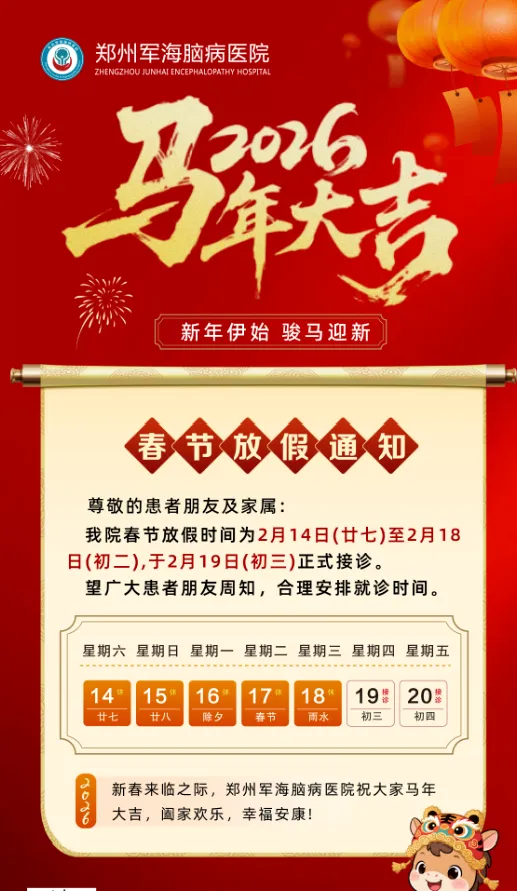 春启新程,福至万家。值此2026丙午马年新春佳节来临之际,为切实保障您的就医权益,合理规划就诊行程,郑州军海脑病医院特发布春节放假及停开诊安排,敬请您知悉,提前做好就诊、复诊规划,避免假期跑空。