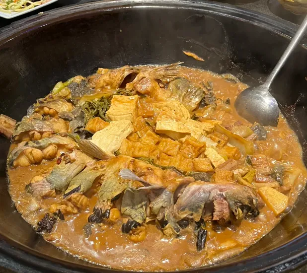 到了晚上,得尝尝北湖炖鱼。不用什么花哨的做法,就是现捞的大鲤鱼,去鳞洗净,在铁锅里用热油两面煎黄,加水慢炖。火候到了,汤色奶白,鱼肉不散不柴,抿一口,鲜味在舌尖打转,那是时间熬出来的味道。