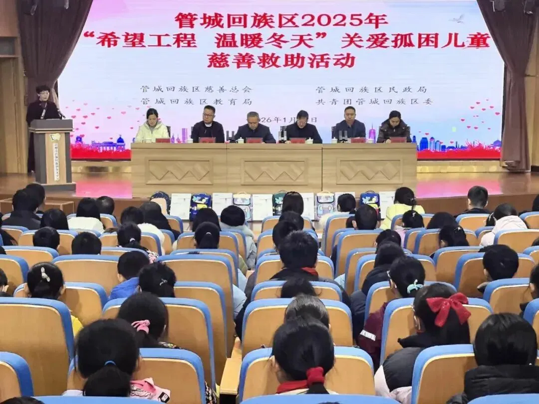 团管城回族区委联合区慈善总会、区民政局、区教育局在东关小学举办关爱孤困儿童慈善救助活动,集中发放总价值10万元的保温杯、护眼灯、书包、文具等过冬与学习物资,惠及332名困难学子,有效整合社会资源,不仅直接解决了部分困难青少年群体的现实困难,更传递了党和政府的温暖及关怀,为区级希望工程社会化动员提供了可复制的实践样本。