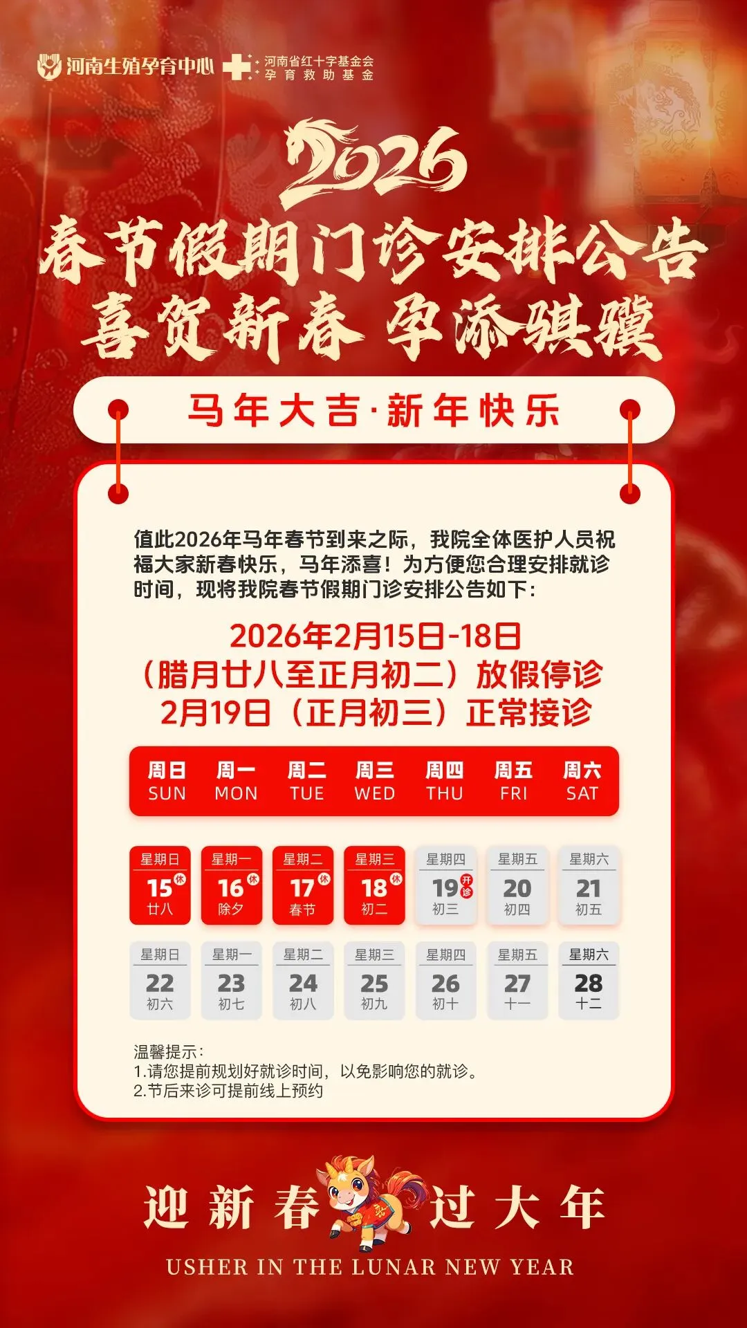 停诊期间,我院将暂停接诊,为您带来的不便,敬请谅解。春节寄托着人们团圆和美、迎祥纳福的美好愿望。在这里,郑州天伦医院全体员工祝福大家新春快乐,马年吉祥如意,求子如愿,好孕满满!新的一年