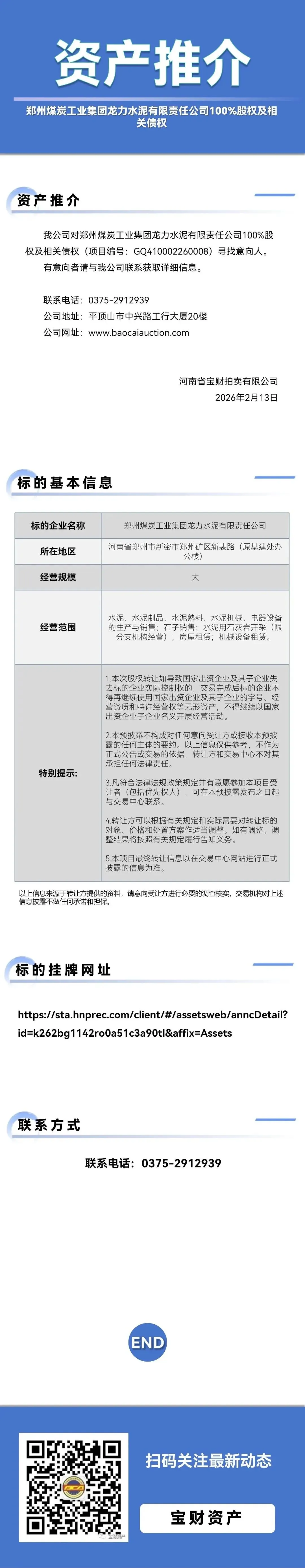 >招商推介 | 郑州煤炭工业集团龙力水泥有限责任公司100%股权及相关债权