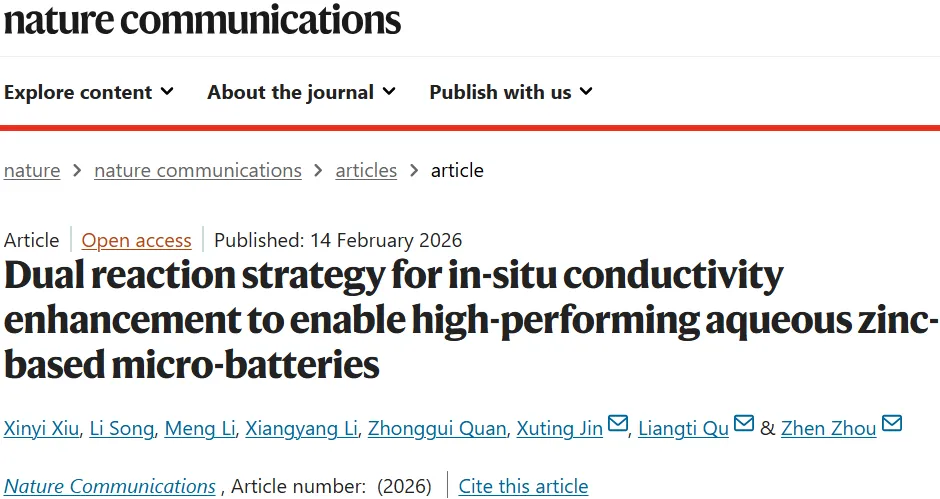 2026年02月14日,郑州大学周震(长江学者)、靳绪庭团队在Nature Communications期刊发表题为“Dual reaction strategy for in-situ conductivity enhancement to enable high-performing aqueous zinc-based micro-batteries”的研究论文,郑州大学Xiu Xinyi、郑州大学河南先进技术研究院Song Li为论文共同第一作者,周震、清华大学曲良体(长江学者)、靳绪庭为论文共同通讯作者。