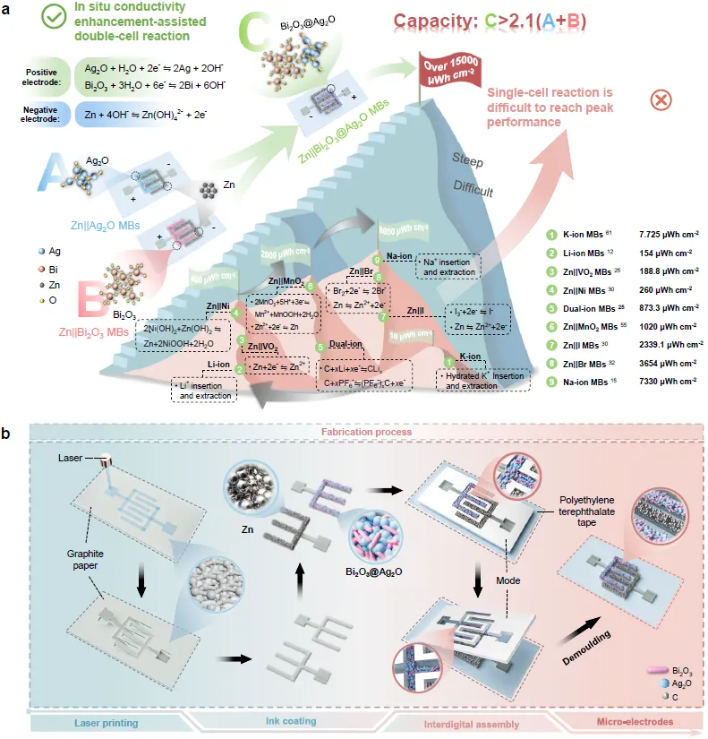 微型电池是为各种智能集成应用供电的有力候选者,然而其通常依赖于充放电循环过程中的单电池反应,这限制了容量和能量密度的提升。