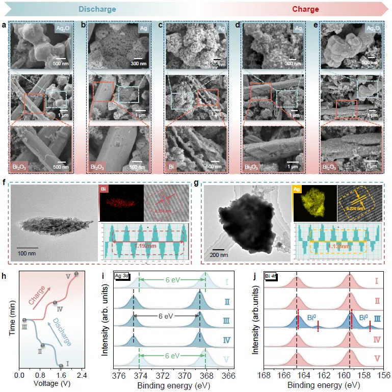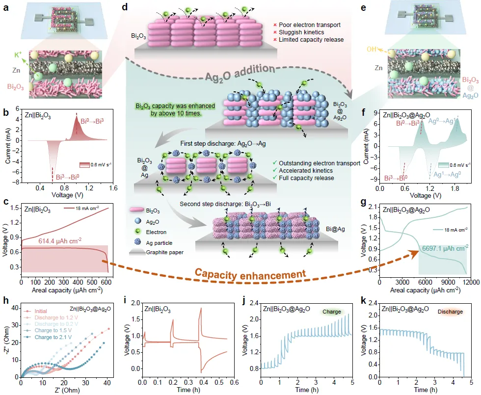 该研究展示了一种原位导电性增强辅助双电池反应策略,用于设计高性能Zn||Bi₂O₃@Ag₂O微型电池,该电池将两个顺序发生的电化学反应集成在一个微型器件中。与简单地组合Zn||Ag₂O和Zn||Bi₂O₃微型电池不同,该策略利用第一步中Ag₂O转化反应的原位导电性增强效应,显著提升了第二步转化反应的放电容量(与单独Zn||Bi₂O₃微型电池相比,提升了近一个数量级),使得总容量达到两个单独微型电池放电容量之和的2.1倍。因此,所构建的微型器件实现了约19000 μWh cm⁻²的高能量密度,并且该微型器件还表现出微型超级电容器级别或更高的功率密度(超过23000 μW cm⁻²)。该研究挑战了传统的微型电池构型,并为构建用于智能集成电子产品的高性能微型电源提供了新策略。