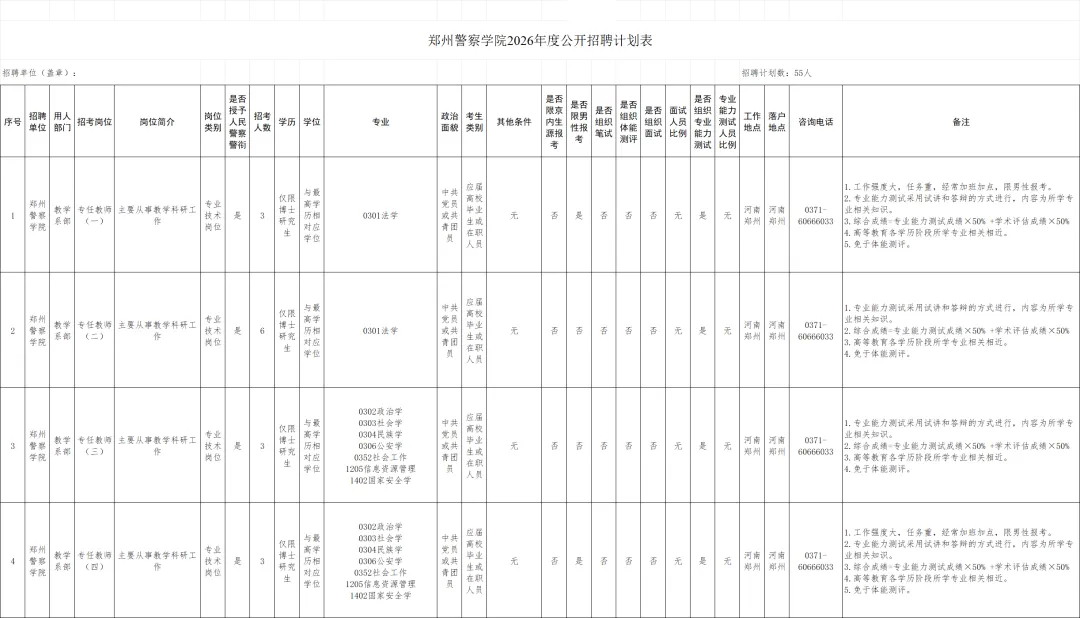 本次招聘共设置19个职位、拟招聘55人,均为学院在编人民警察。