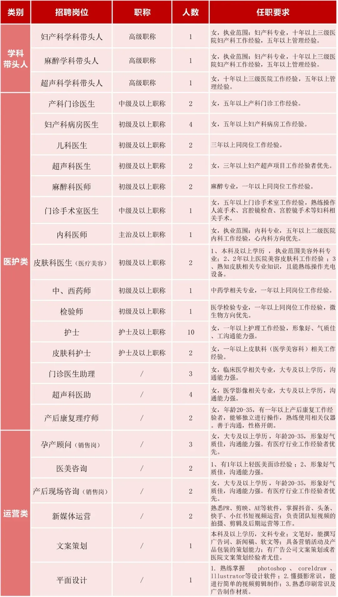 医院有员工400余人,专业技术人员217人,其中高级职称30余,医院设有妇科、产科、新生儿科、儿童保健科、小儿内分泌科、计划生育科、生殖健康与不孕不育科、妇女保健科、预防保健科、内科、外科、中医科、中西医结合科、麻醉科、手术室、急诊科、眼科、耳鼻喉科、口腔科等临床科室,设置有超声科、心电图、检验科、血库、放射科、病理科、药剂科等医技科室。