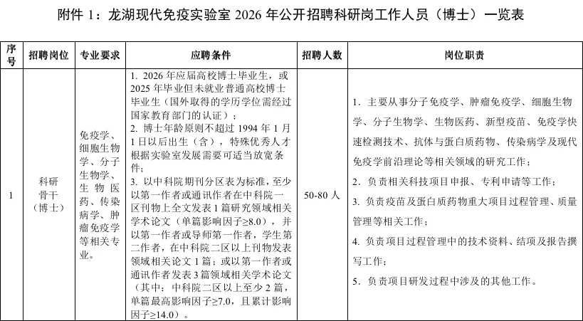 招聘岗位为科研岗工作人员。其中科研骨干(博士)50-80名、独立课题组长/研究员(PI)15-20名,具体招聘要求详见《龙湖现代免疫实验室2026年面向社会公开招聘科研岗工作人员(博士)一览表》(附件1)。