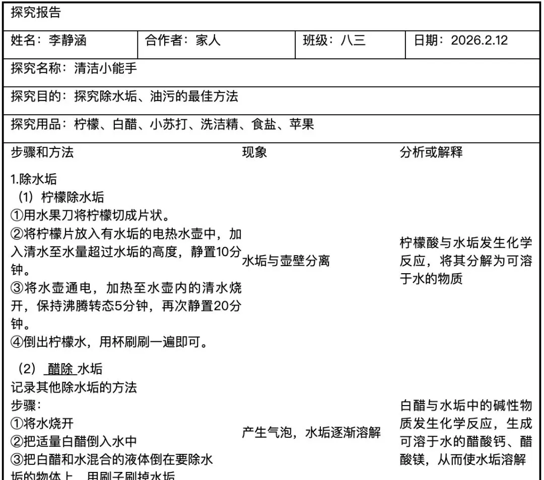 在科学探究篇中,八年级数学组引导学生观察雪花形状,借助软件验证推测,并结合化学结晶知识深化理解;七年级数学组聚焦网络现象,通过问卷调查与访谈,用饼状图、柱状图呈现数据,提出真诚倡议;八年级生物组关注环境问题,设计对照实验探究酸雨对种子萌发的影响;地理组走进田间地头,实地调查家乡特产的产销情况;九年级化学组则化身“清洁小能手”,动手探究水垢与油污的清除技巧,揭示背后的化学原理。