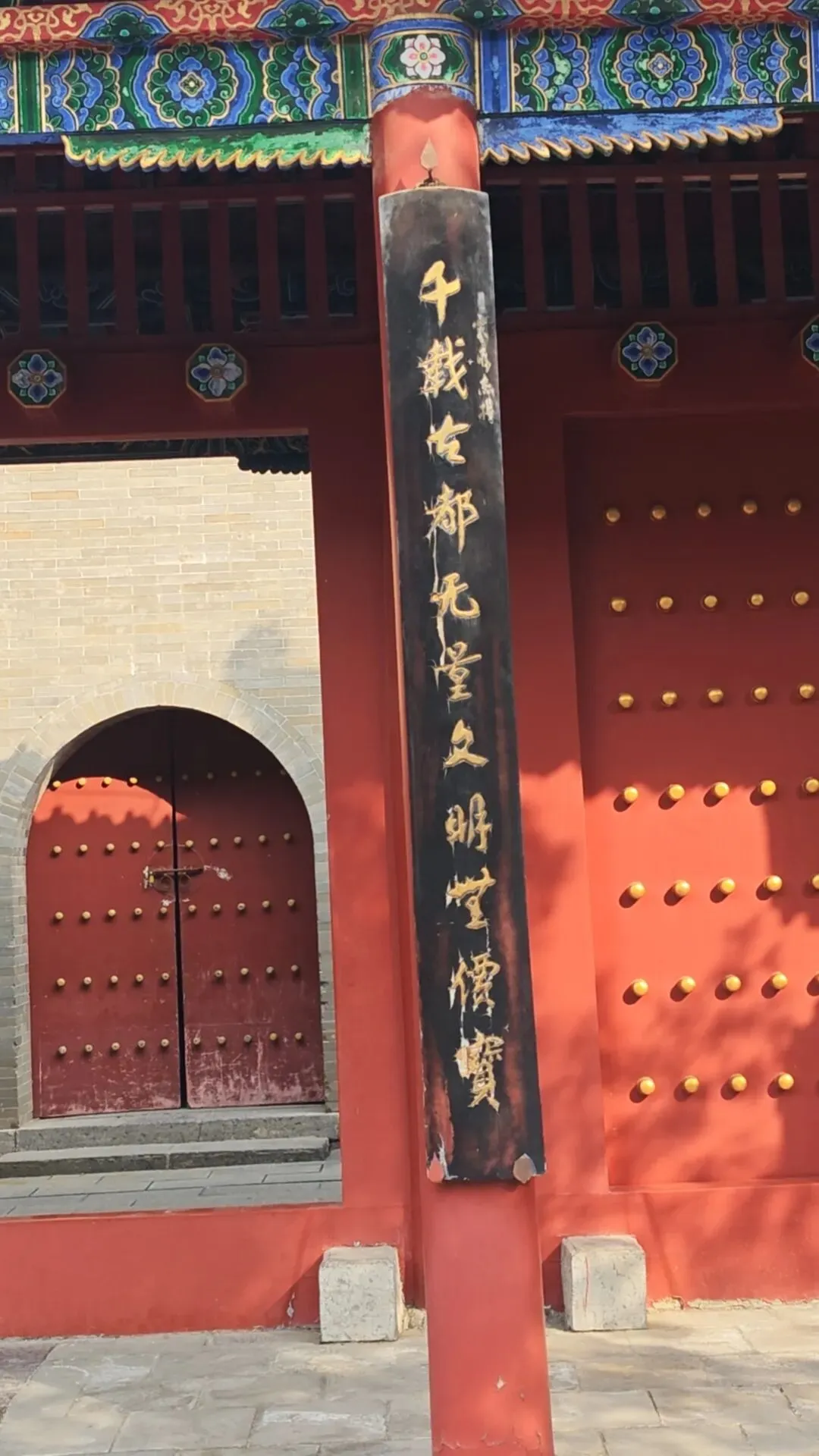 郑州商城路上的城隍庙,占地十多亩,沿街牌楼式建筑庙门,门楣金字招牌“城隍庙”三个烫金大字,熠熠生辉。拾级而上进入庙堂山门,抬头望山门古建雕梁画柱,檐头以七级斗拱挑檐,庄重大气。硕大的红漆庙门被金光灿灿的宝钉给装饰一新,威严大气,大宝盖钉上下排列整齐,金灿灿,亮闪闪,一扇门七七四十九颗门钉预示着城隍庙乃主管一方黎民的城隍爷神祇在此。走进城隍庙山门,迎面还有一道二门,二门楹柱上的对联吸引了老衲的目光。上联:千载古都无量文明無价寶。下联:一肩重任满腔忠贞满城福。寥寥数语,把一方神祇为民福祉推上前台,尤其是下联,更是充满了为官一任造福一方的豪迈壮志冲云霄。