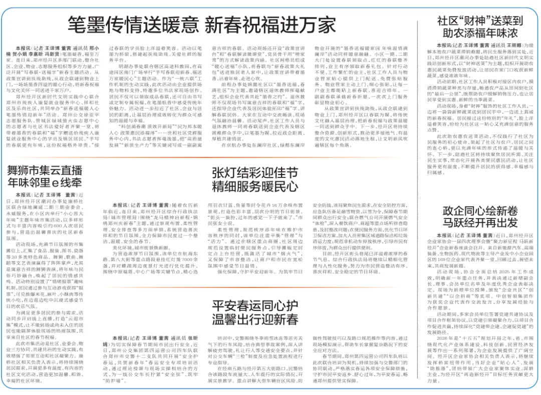 从政策宣讲到扶残助残,从政企联建到物业上门,郑州经开区以春联为媒,将传统文化融入基层治理,把新春祝福与政策温暖一同送到群众手中。下一步,经开区将持续整合资源、创新形式,推动更多接地气、有温度的文化惠民活动落地生根,让文明新风吹遍辖区每个角落。